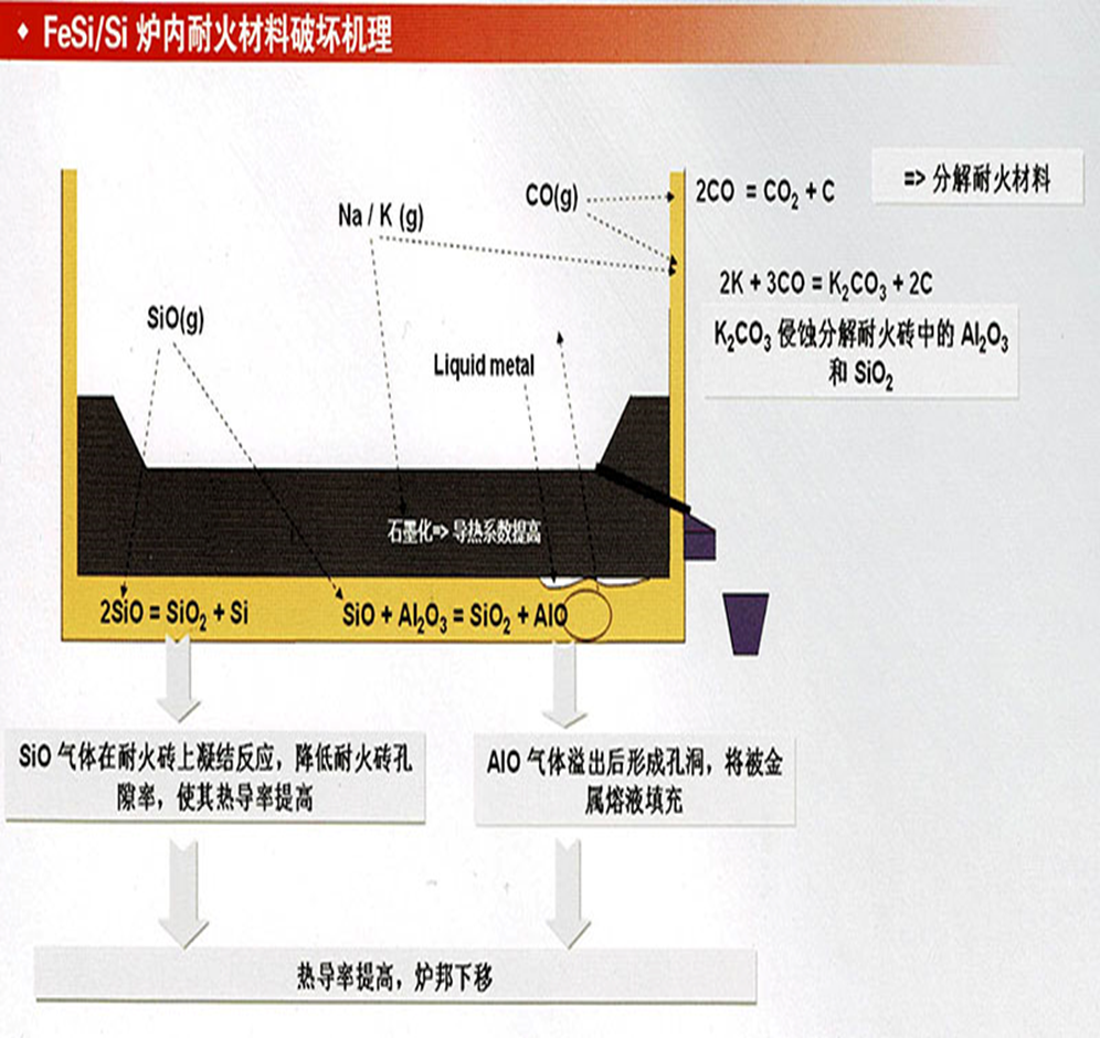 礦熱爐冶煉普遍溫度較高。1700-1800℃的高溫下,這遠(yuǎn)遠(yuǎn)高于常規(guī)耐火材料最大工作溫度。一般Sio2/Al2O3質(zhì)耐火材料容易被高溫溶液侵蝕。然而SiC糊料在1400-1600度高溫下形成新的二次SiC和Si3N4物相,使結(jié)合強(qiáng)度增加的同時,新的物相不被熔渣濕潤,又能夠填補(bǔ)高溫收縮后的縫隙,從而延長使用壽命。